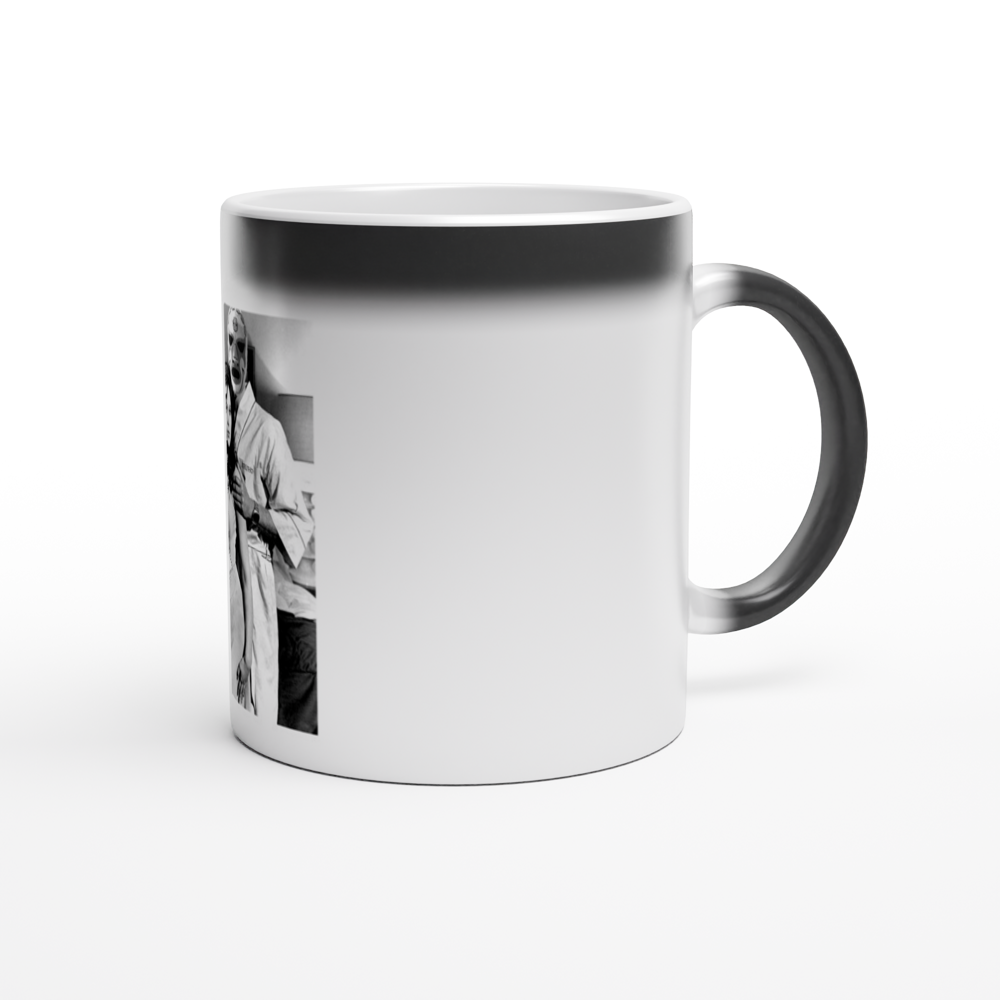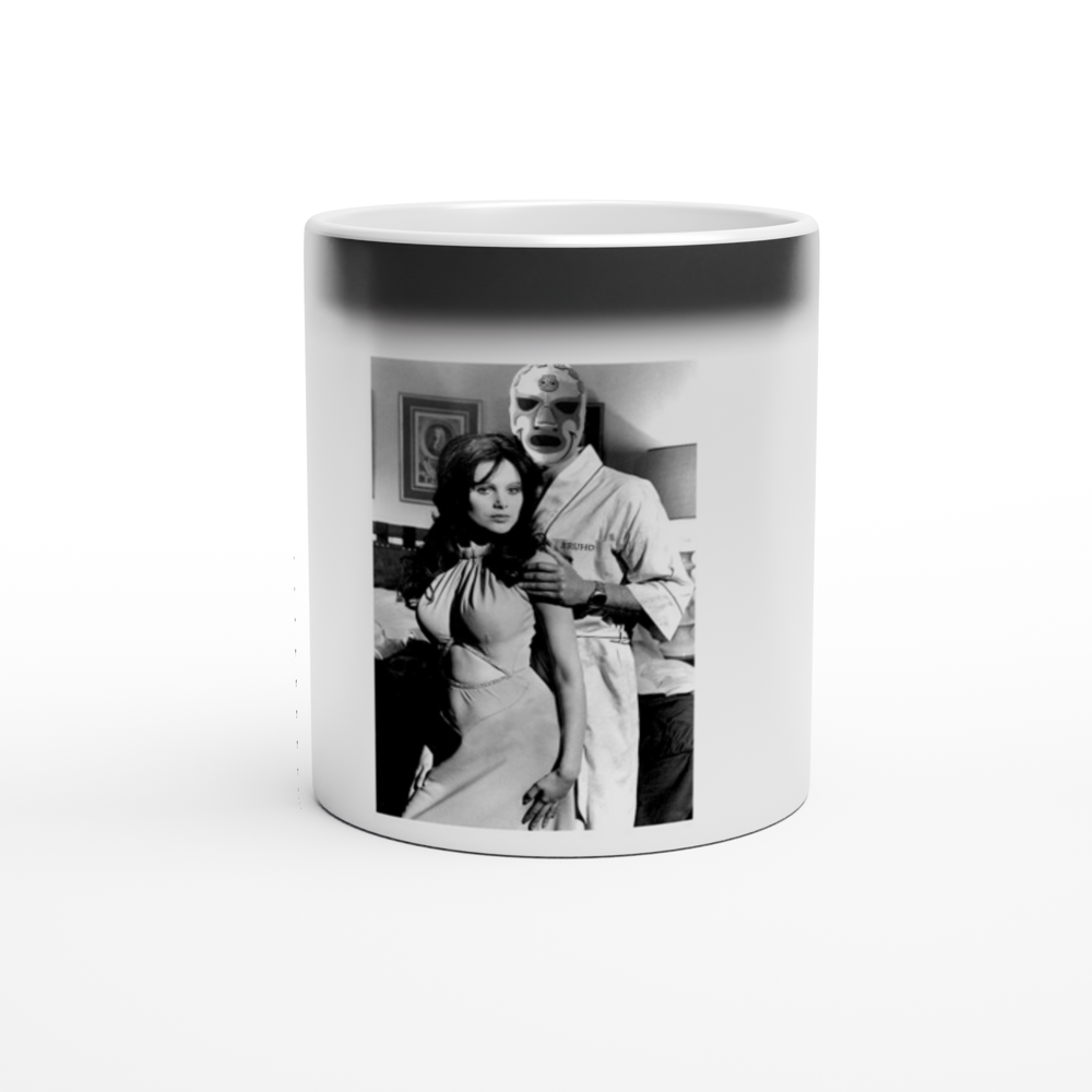 This mug has a black glossy finish when it's empty. When a hot beverage is added, the mug reveals Bruho and his partner.