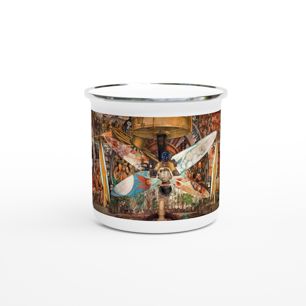 Based on the Controlador Mural by Diego Rivera in the Palacio de Bellas Artes in Mexico, this retro Enamel Mug features Bruho at the center controlling modern society.